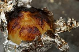 En un extremo de la cebolla, has un corte profundo en cruz, sin llegar hasta el fondo, luego introduces en medio del corte una cucharada de mantequilla y una tercera parte o un cuarto del cubo de caldo de costilla jugosa (según el tamaño de la cebolla). Hecho esto, en un trozo de papel aluminio la envuelves completamente, que el trozo de papel aluminio sea lo suficientemente grande para cubrirla con holgura. Ya estás listo para meterlas a cocer al asador o anafre, según lo que ocupes, en ambos casos vas a colocar las cebollas en la parte donde cae el tizne del carbón, es decir en la parte de hasta abajo del asador o anafre, hasta que queden bien suavecitas, esto dependerá del tamaño de las cebollas, pero será aproximadamente entre 25 y 35 minutos.